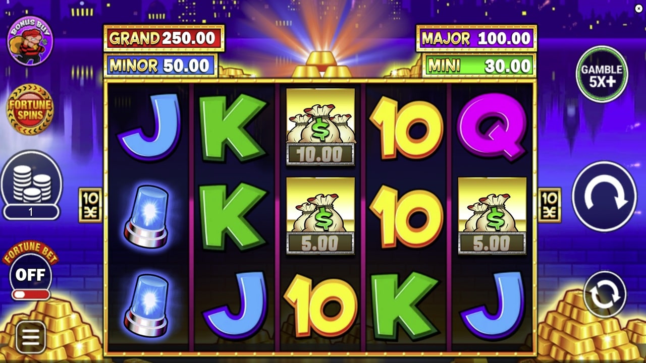 - Wild Symbols: The robber himself acts as the wild, substituting for all symbols except the scatter. He also doubles as a collector symbol, gathering cash and prize pot values when he lands during Fortune Spins or bonus rounds.