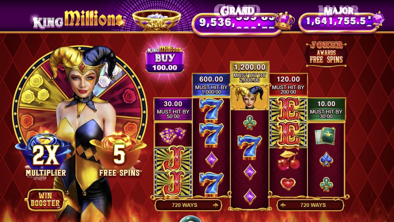 - King Millions Bonus & Progressive Jackpots: Collect King Millions tokens for a chance to trigger the King Millions Bonus Wheel. This can deliver cash prizes worth 7x to 500x your bet or award one of the two global progressive jackpots. The higher your stake, the better your chances of triggering the feature. You can also buy direct access to the King Millions Bonus for 100x your bet. Progressive jackpot values accumulate from a portion of wagers, reset when won, and contribute 4.5% of all bets.