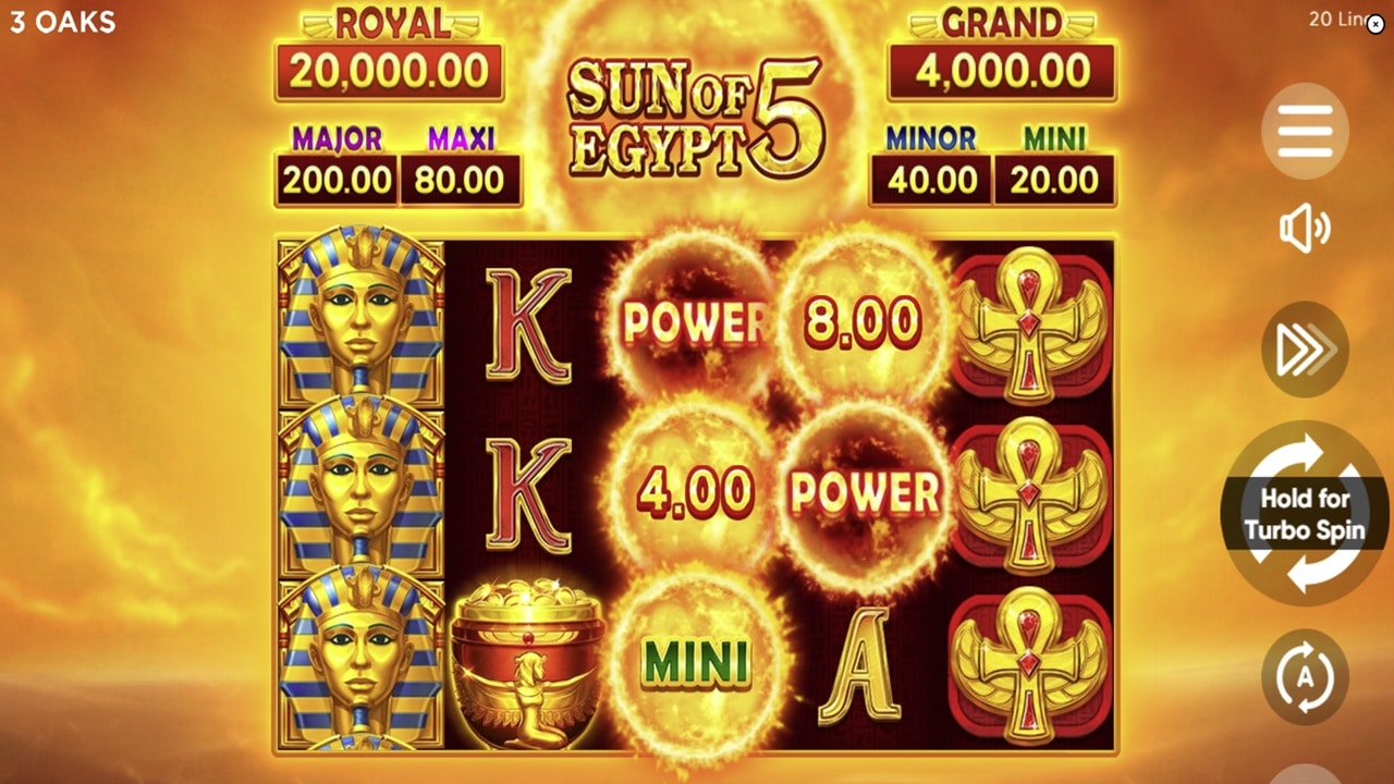 The Sun of Egypt 5 slot and online pokie game continues the popular series from Booongo (3 Oaks Gaming). Played on a 5×3 reel set with 20 paylines, it combines traditional Egyptian-themed symbols with a modern hold-and-win style bonus. Wilds, scatters, and power symbols are all here, along with jackpots that range from Mini to the huge Royal prize worth 5,000x.