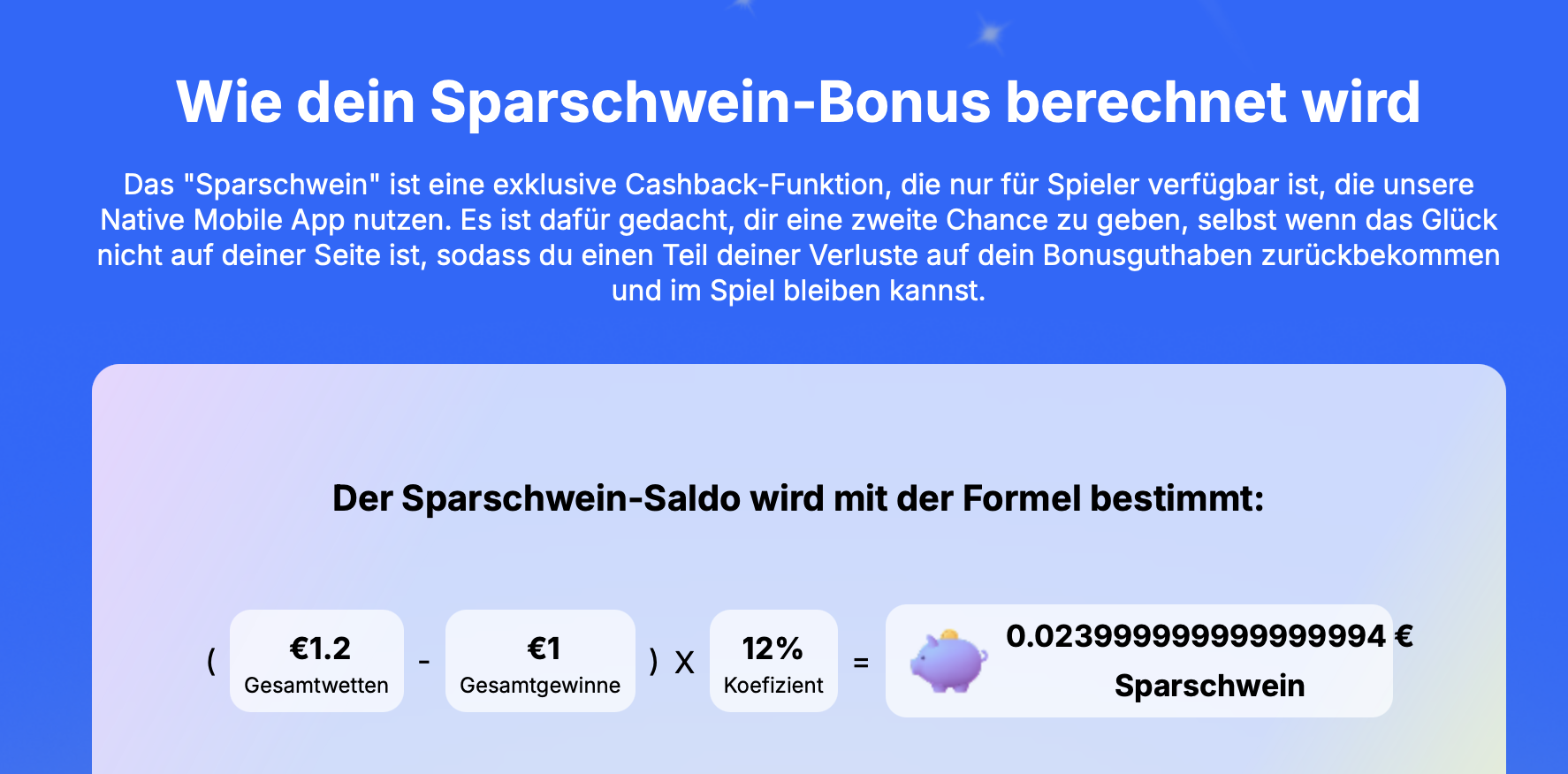 Saugeiler Sparschweinbonus. Verlust - Gewinn ergibt einen Prozentwert an Geld, der geht aufs Casino Sparbuch und lässt sich dann gemütlich abspielen. Cooler Cashback Bonus sehr zu empfehlen.