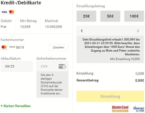 Jetzt können Sie die Einzahlungssumme festlegen und mit dem CVC-Sicherheitscode die Transaktion bestätigen. Es muss aber nicht immer so laufen. Die Daten der Online Casino Kreditkarte können auch direkt bei der Zahlungsanweisung angegeben werden und der Vorgang wird durch den Sicherheitsschlüssel der Karte in Gang gesetzt. Der Einzahlungsbetrag wird sofort danach in Echtgeld auf Ihrem Spielerkonto gutgeschrieben. Sollten Sie eine Gratifikation in Anspruch nehmen, dann achten Sie unbedingt darauf, den Bonus Code mit anzugeben, wenn es ein separates Feld im Zahlungsfenster dafür gibt.